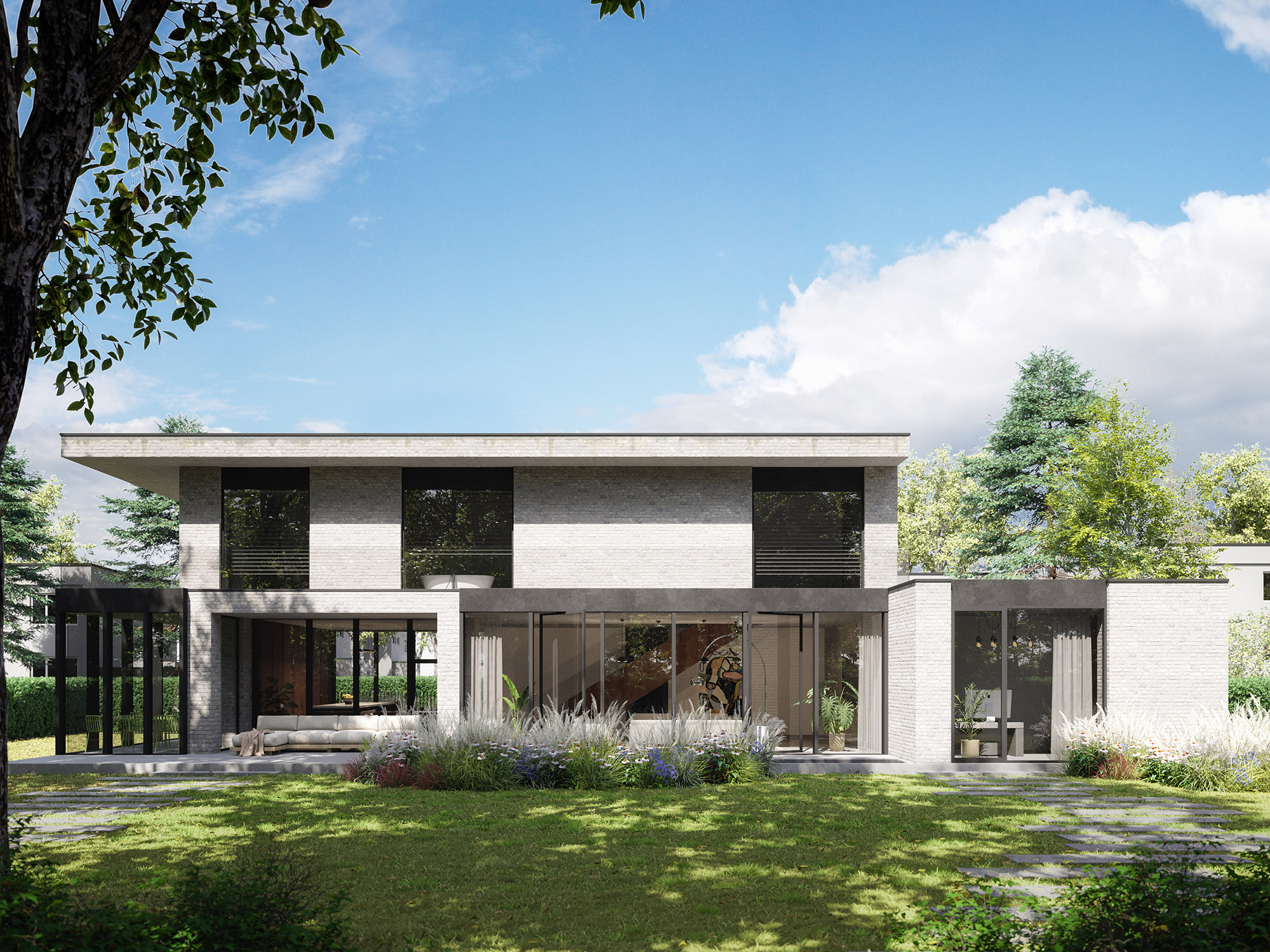 The designed single-family house is located in a residential district of Katowice, in close proximity to a forest park. The investors dreamed of a house that would open up to the surrounding landscape, while at the same time providing privacy, especially from the entrance to the plot. Therefore, from the side of the cattle garden, the building was carved out, creating offsets, roofed alcoves and specific nooks, creating pleasant, shaded spaces for relaxation. From the side of the road, the body is more economical in perforations and cutouts and constitutes a visual barrier and “fence”. The first floor, with a much smaller outline, was superimposed on the ground floor in such a way that its rooms (bedroom part) had a view of the green area. The elevation of the building was designed from natural elongated brick, supplemented with details made of black steel sheet.