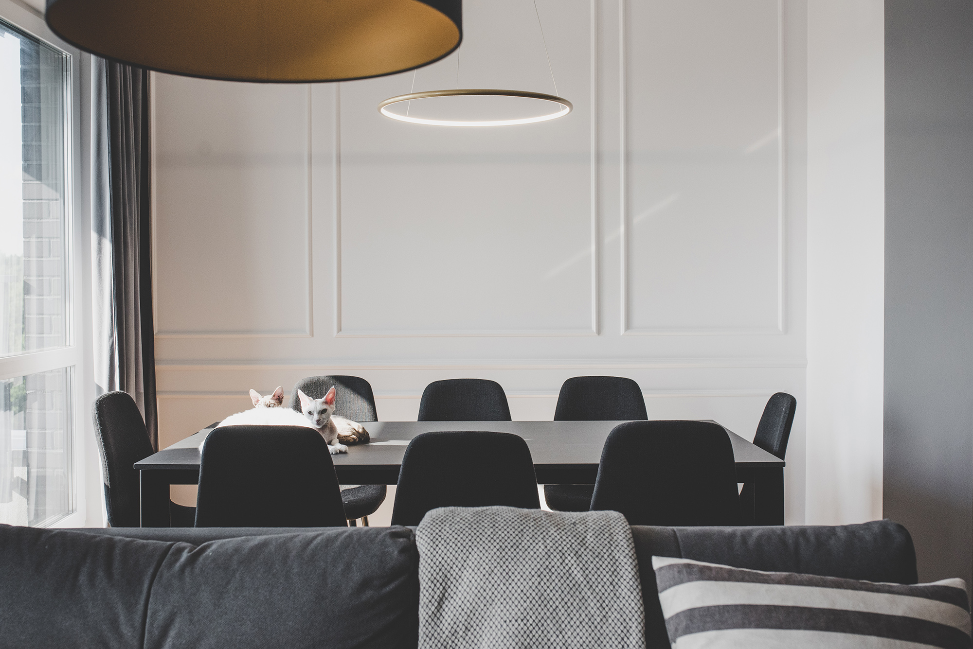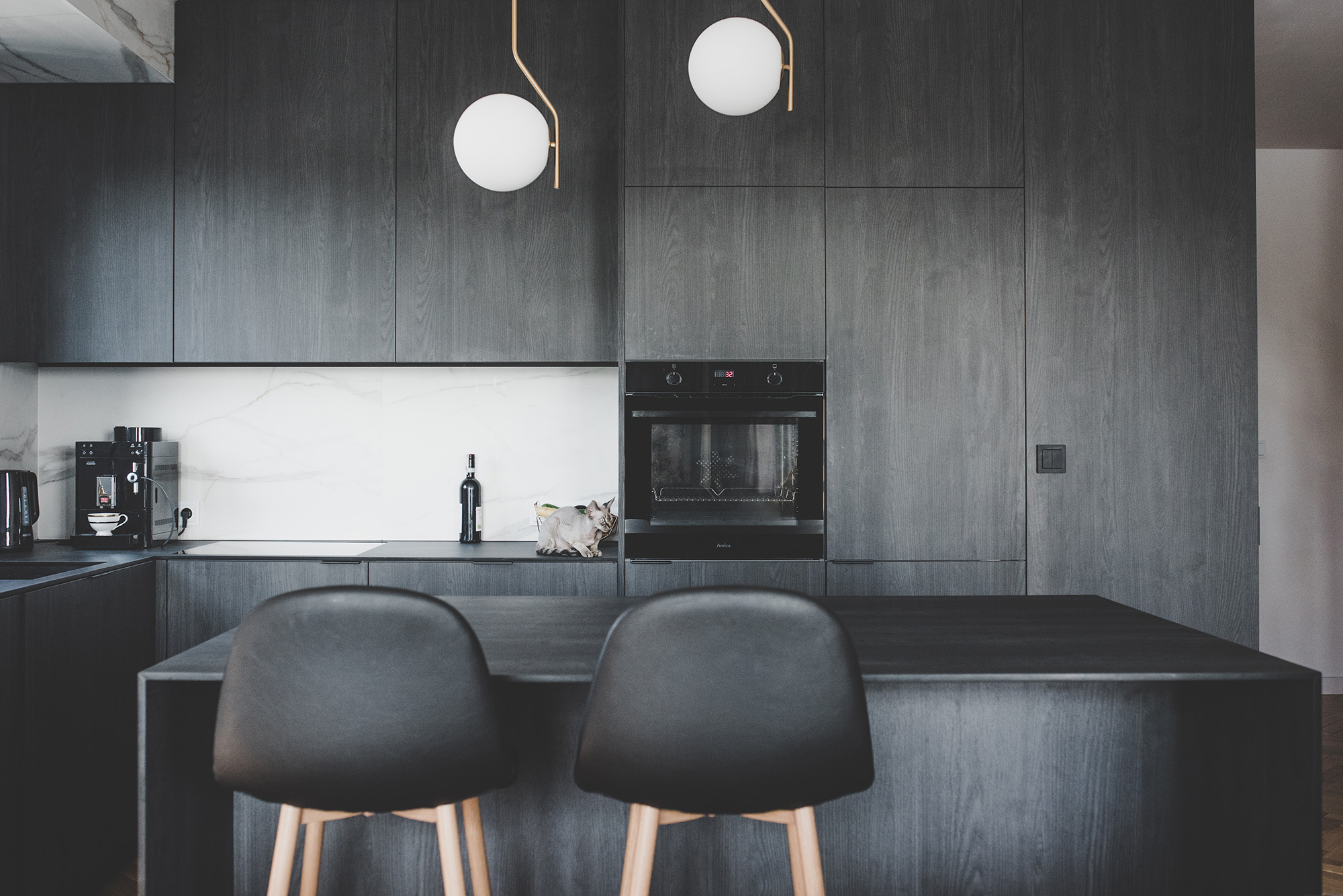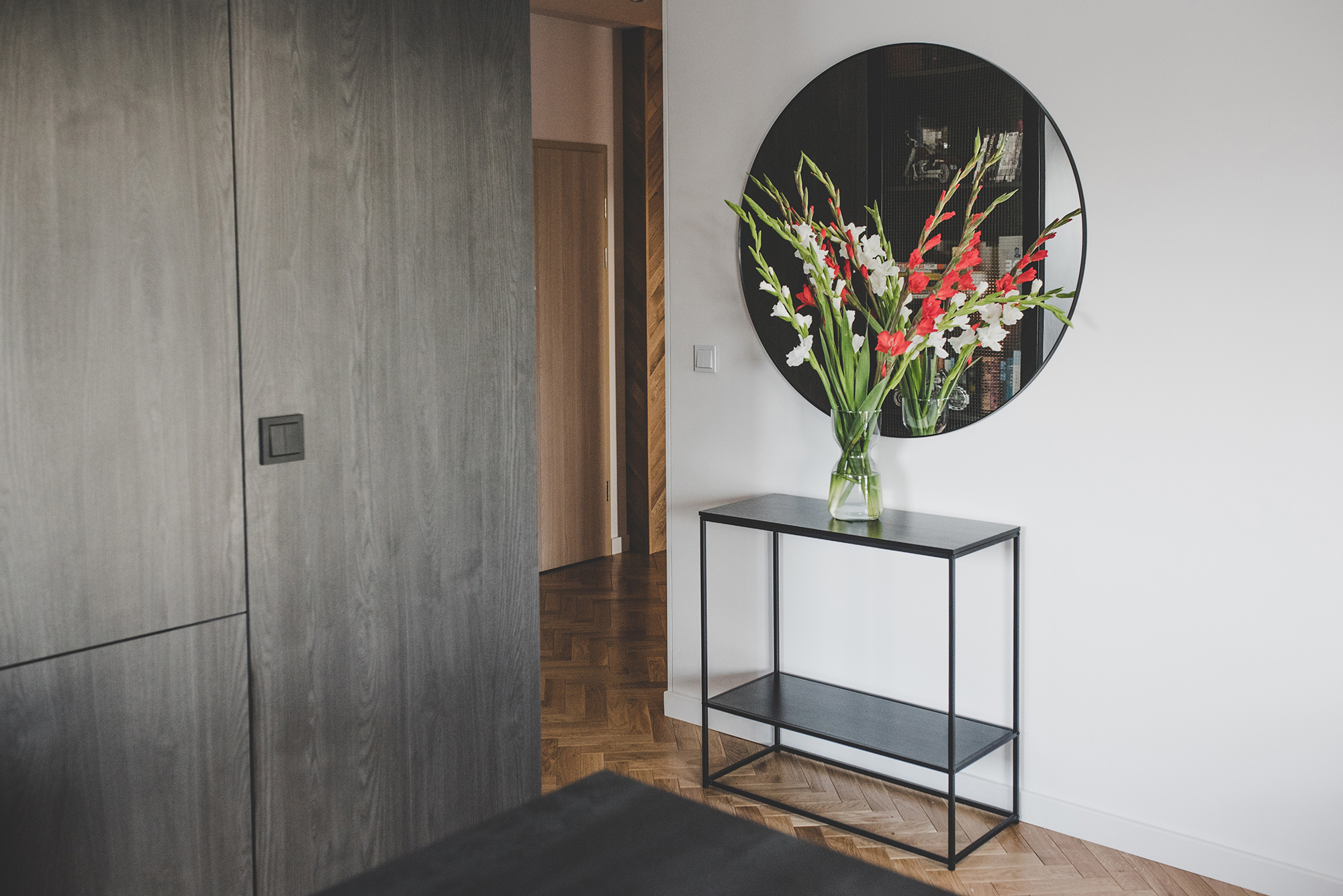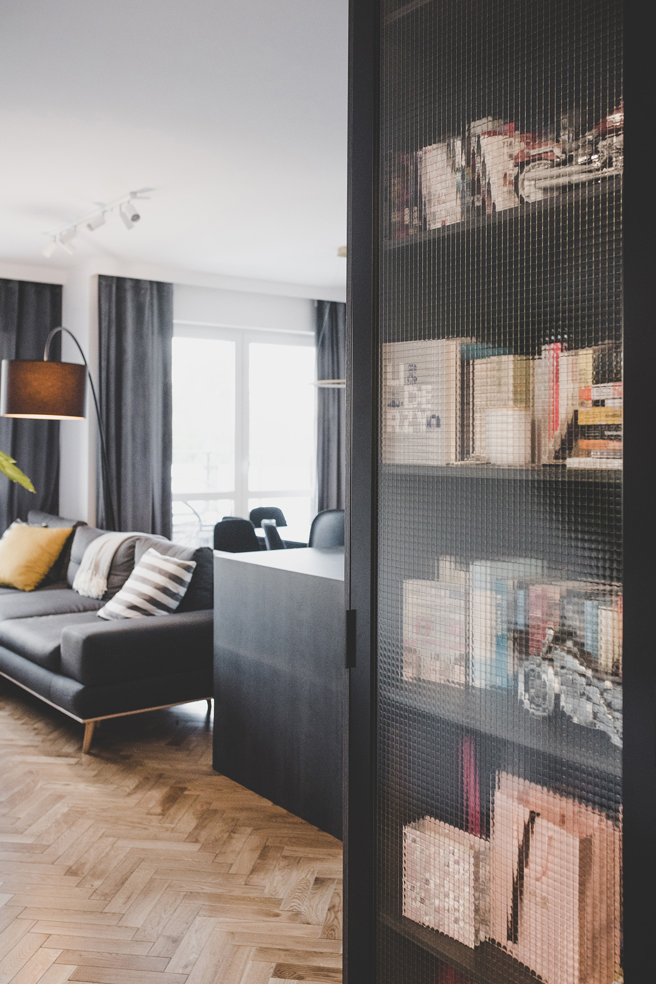 Głównym elementem, który organizuje wnętrze otwartej dziennej strefy mieszkania jest tzw. „corner” – zabudowa łączące kuchnię, biblioteczkę oraz ukryte wejście do sypialni. Wykończony jest on charakterystycznym, grafitowym laminatem – z tego materiału wykonana jest również wyspa, zabudowy meblowe w łazienkach – pojawia się on konsekwentnie w całym wnętrzu.