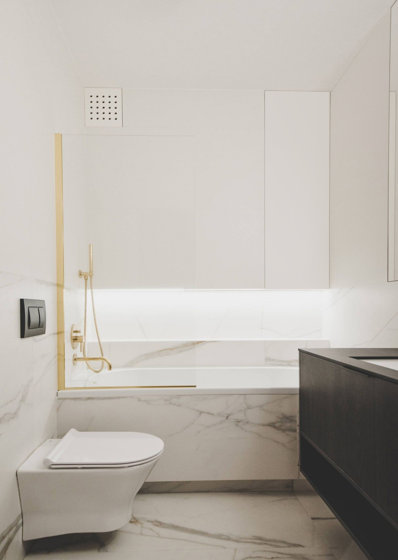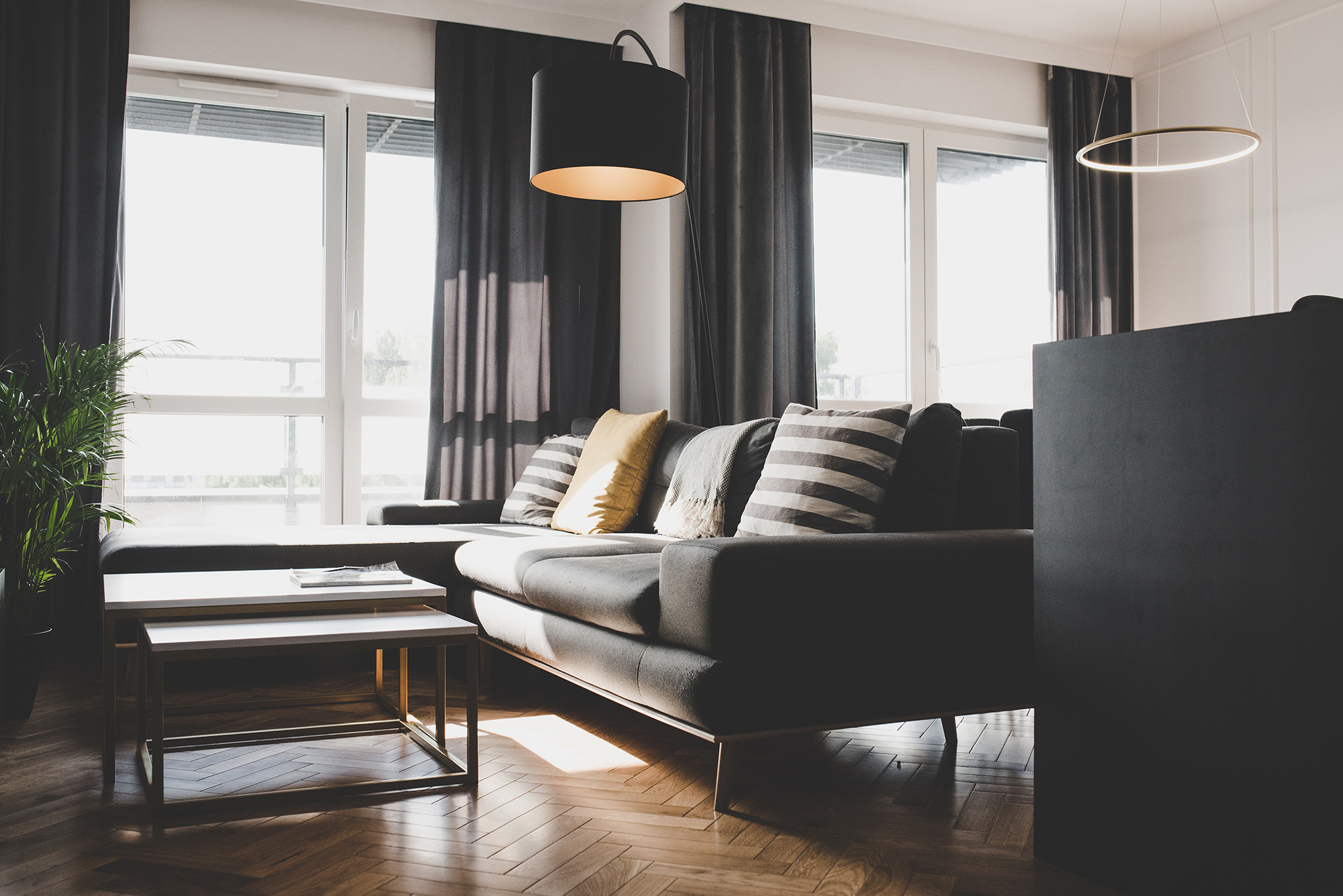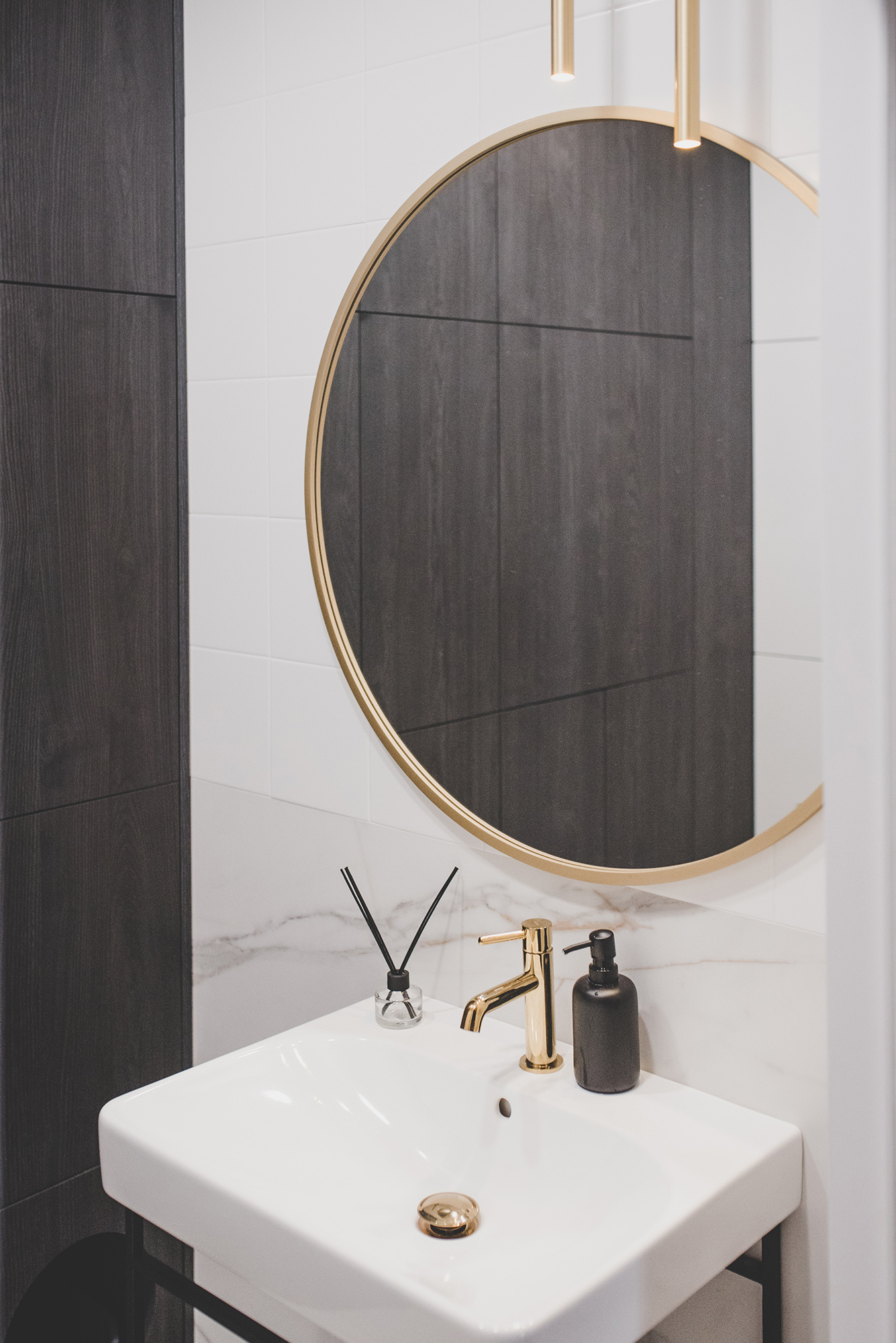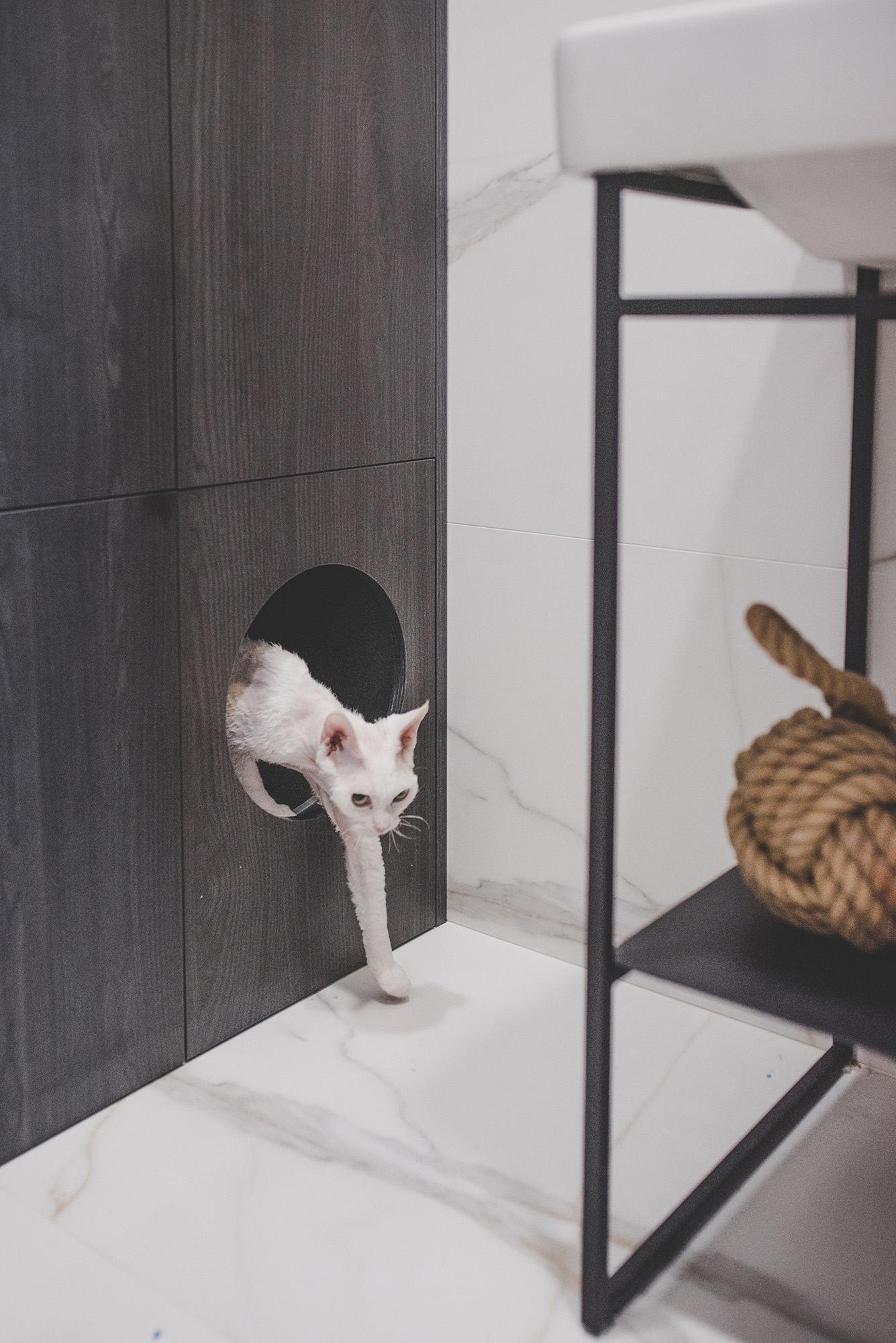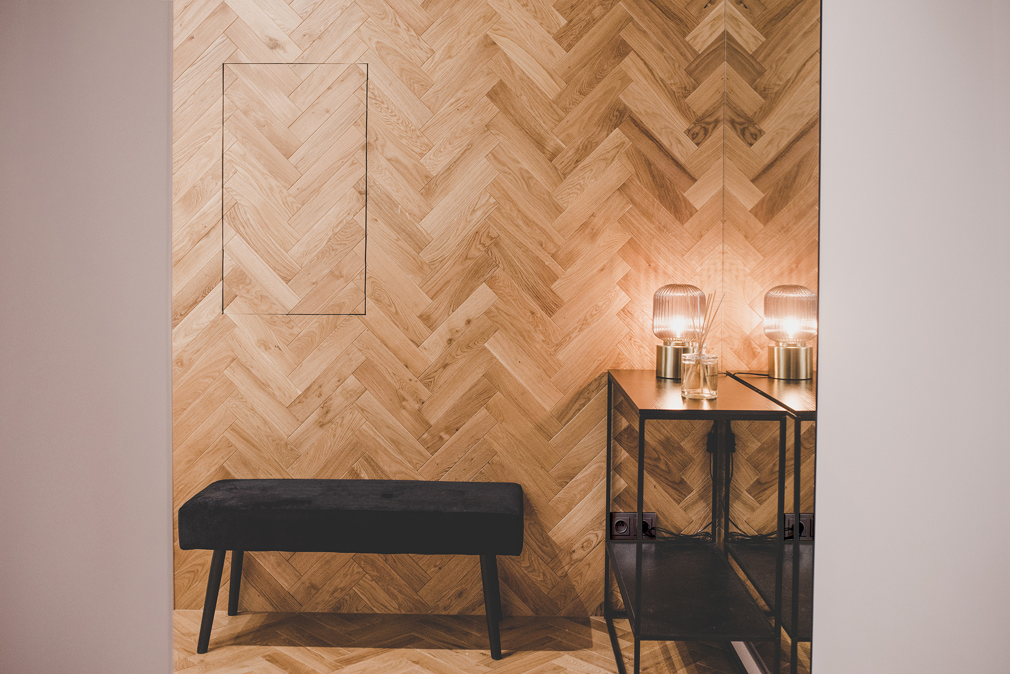 Głównym elementem, który organizuje wnętrze otwartej dziennej strefy mieszkania jest tzw. „corner” – zabudowa łączące kuchnię, biblioteczkę oraz ukryte wejście do sypialni. Wykończony jest on charakterystycznym, grafitowym laminatem – z tego materiału wykonana jest również wyspa, zabudowy meblowe w łazienkach – pojawia się on konsekwentnie w całym wnętrzu.