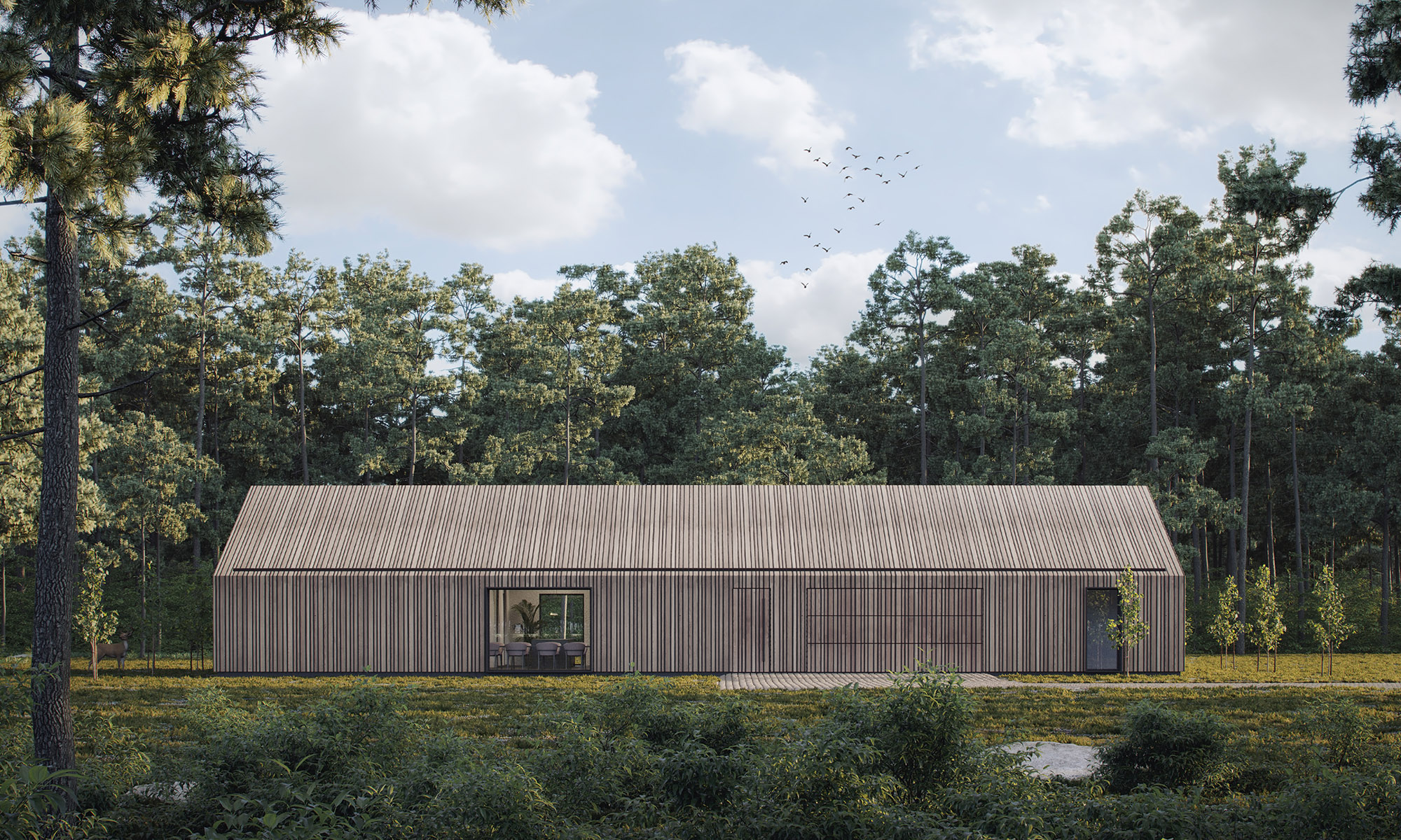 Projektowany dom jednorodzinny jest zlokalizowany w niewielkiej miejscowości Kobiór, położonej niedaleko Pszczyny. Działka, na której ma znaleźć się dom położona jest na skraju wsi i lasu i należy do ostatnich zabudowań. Zaraz obok rozpościera się gęsty las, należący do tzw. „Puszczy Pszczyńskiej”. Las był punktem wyjścia w procesie projektowym. Inwestor zdecydował się na kupno działki głównie ze względu na lokalizację i bliskość lasu i była to dla niego najwyższa wartość, wokół której powinien koncentrować się projekt. Obiekt zorientowany jest na osi północ-południe, z elewacją wschodnią zwróconą w stronę ściany lasu. Bryła budynku jest bardzo prosta, podyktowana ustaleniami miejscowego planu zagospodarowania przestrzennego. Dom parterowy, czytelnie podzielony na część dzienną i nocną, z wbudowanym garażem. Podłużna bryła została zperforowana dużymi otworami okiennymi, dzięki temu z każdego pomieszczenia zarówno części dziennej jak i nocnej w domu rozpościera się widok na las.