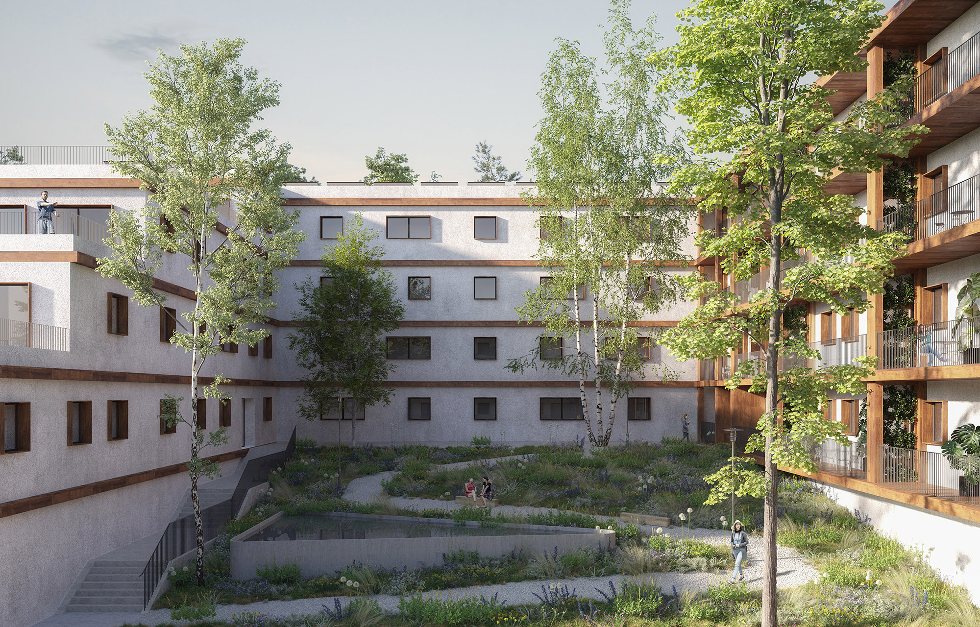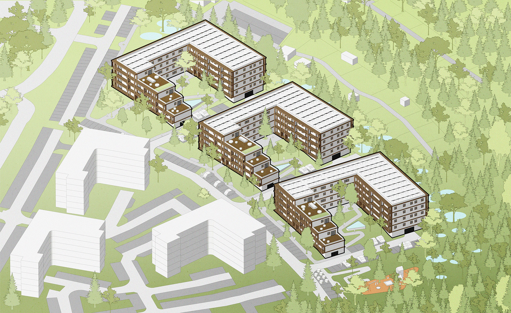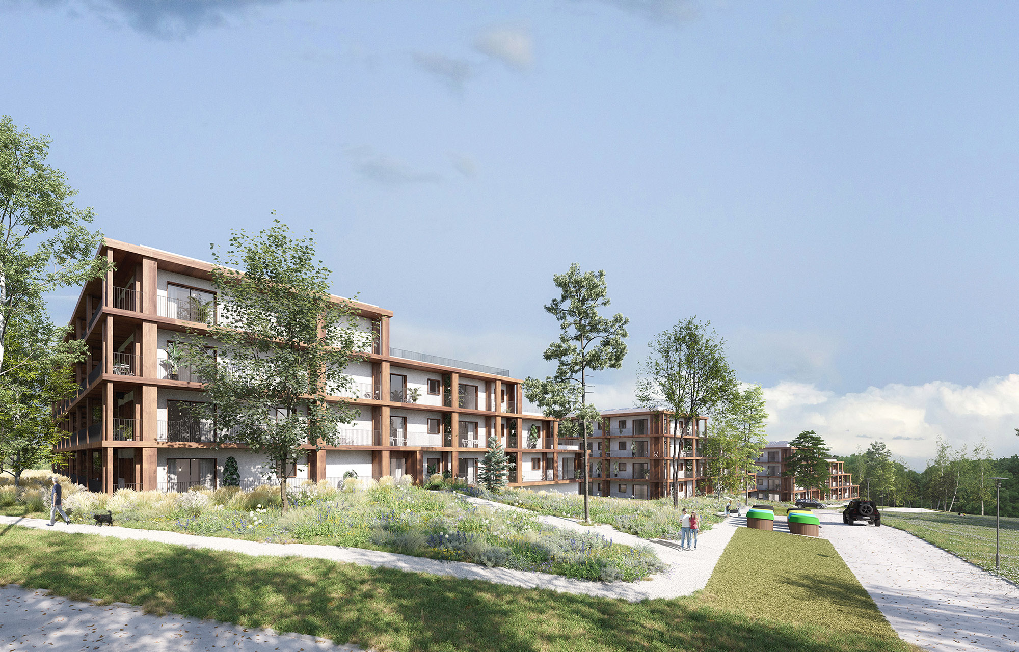Koncepcja konkursowa zabudowy mieszkaniowej wielorodzinnej w konkursie organizowanym przez SARP Katowice na zlecenie Bielsko-Białego TBS Sp. z o.o. Dominującym punktem wyjścia była lokalizacja inwestycji – teren z mocnym spadkiem w kierunku północnym, otoczony gęstą, leśną zielenią. Zabudowa została podzielona na trzy powtarzalne budynki w układzie kaskadowym, same bryły budynków zostały ukształtowane również w formie kaskad – każda następna kondygnacja posiada mniejszą powierzchnię od poprzedniej. Taki zabieg pozwalał na optymalne nasłonecznienie mieszkań, jak również harmonijnie wpisywał bryły w pochyły teren. Przez duży spadek udało się również uniknąć wjazdów do garaży podziemnych przez rampy – wszystkie garaże dostępne są z terenu. Budynki posiadają obszerne galerie, wykonane z prefabrykatów z drewna w technologii CLT, co stanowi charakterystyczny detal elewacji. Inwestycja bazuje na odnawialnych źródłach energii, jak również zaprojektowano rozległy system gospodarowania i wykorzystania wody deszczowej – od systemu tzw. „szarej wody”, po niecki chłonne i ogrody deszczowe, aż po naziemne zbiorniki, stanowiącej również część stref rekreacyjnych.